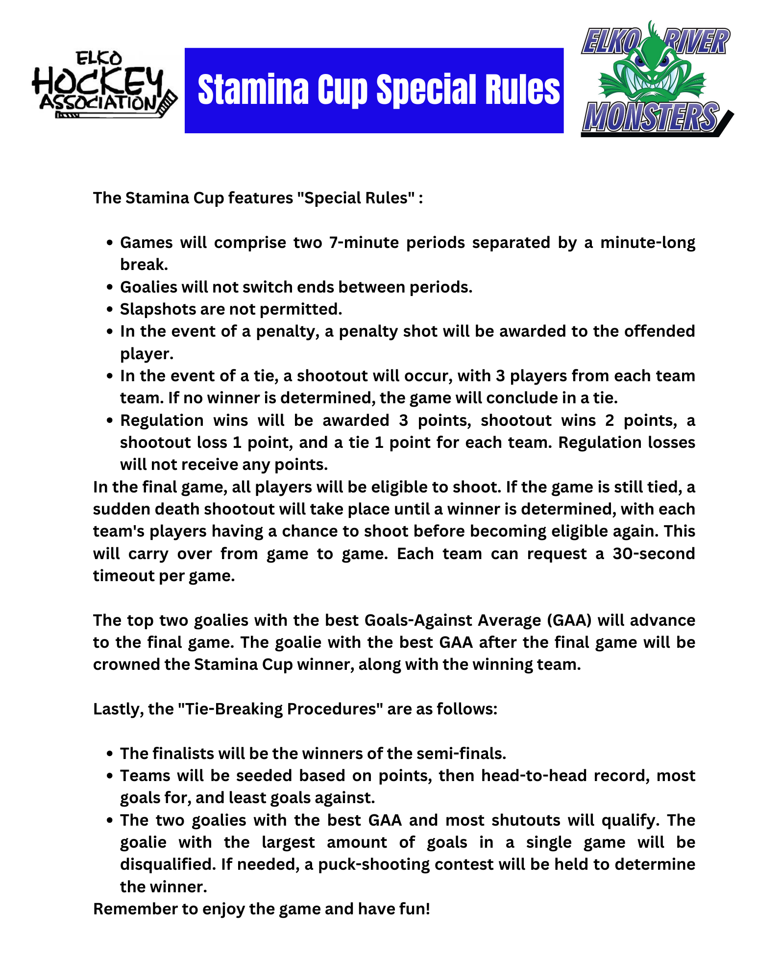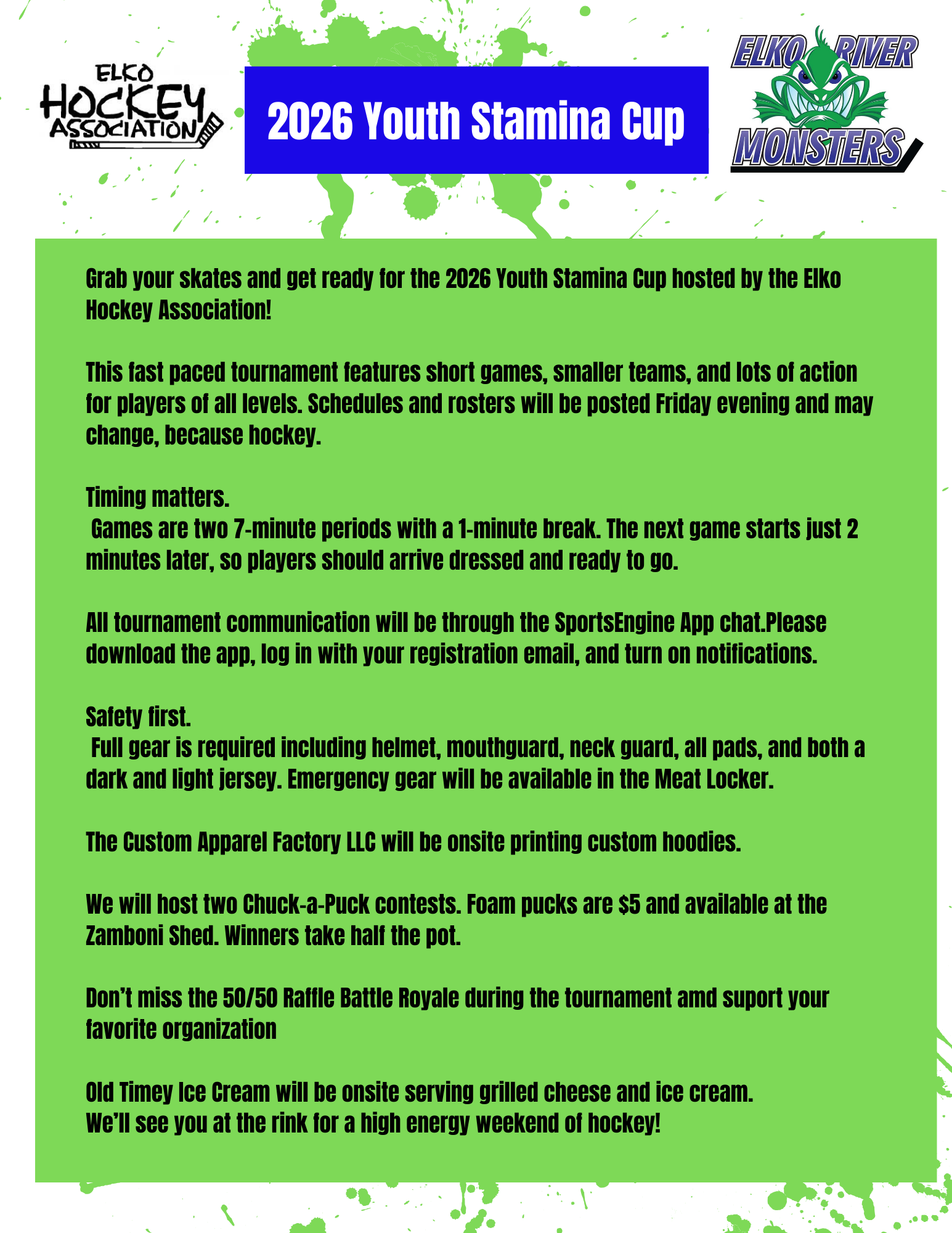 To make it easy to find, we've included all of the information from the Elko Hockey Association for their Stamina Cup Tournament below.